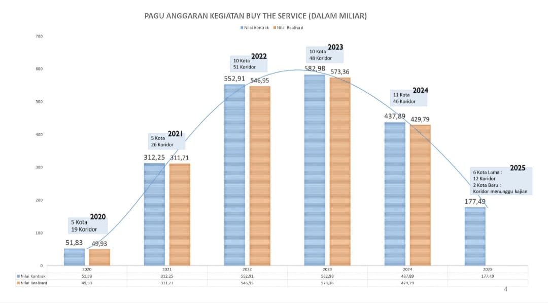 Anggaran yang dialokasikan untuk skema ini menunjukkan tren penurunan signifikan. Setelah mencapai puncaknya di angka Rp 582,98 miliar pada 2023, alokasi anggaran justru terus menurun. Berikut adalah rinciannya tahun 2020 sebesar Rp 51,83 miliar (5 kota, 19 koridor), tahun 2021 (Rp 312,25 miliar, 5 kota, 26 koridor), tahun 2022 (Rp 552,91 miliar, 10 kota, 51 koridor), tahun 2023 (Rp 582,98 miliar, 10 kota, 48 koridor), tahun 2024 (Rp 437,89 miliar, 11 kota, 46 koridor), tahun 2025 (Rp 177,49 miliar, 6 kota, 16 koridor), dan 2026 (Rp 82,6 miliar direncanakan, hanya untuk 5 kota).